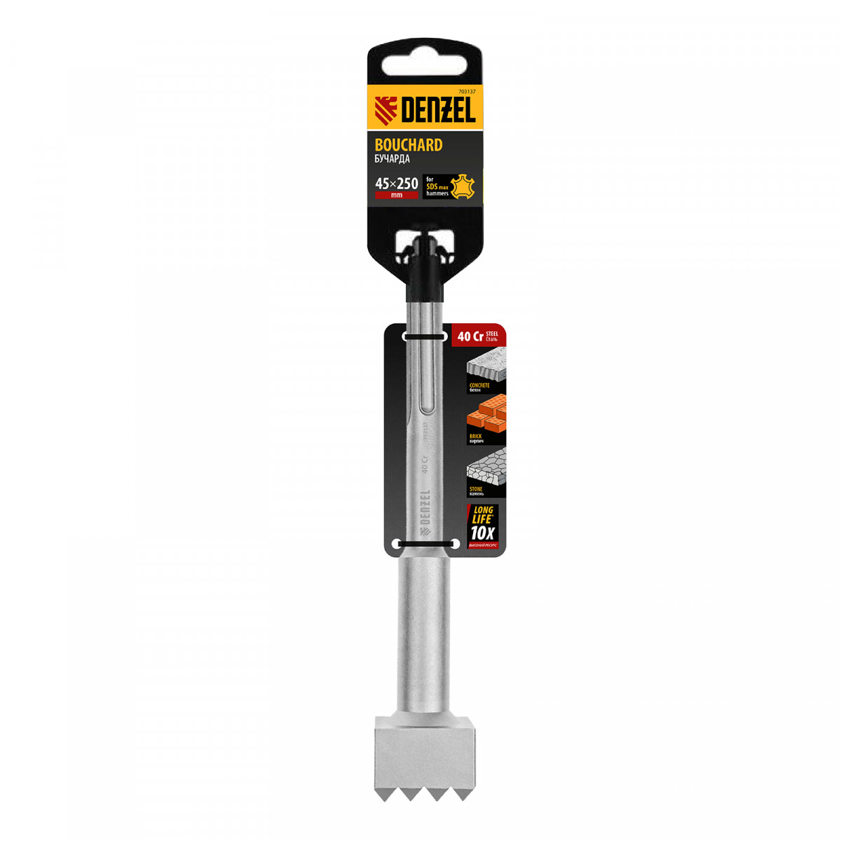 Бучарда Denzel 703137 размером 250 x 45 мм, с хвостовиком SDS-max, устанавливается в патрон перфоратора и используется для выполнения ударных работ. Позволяет придать шероховатость твердым поверхностям, оптимальна для обработки камня, кирпича, бетона, мрамора, гранита. Также применяется для удаления старых штукатурных и лакокрасочных покрытий.
