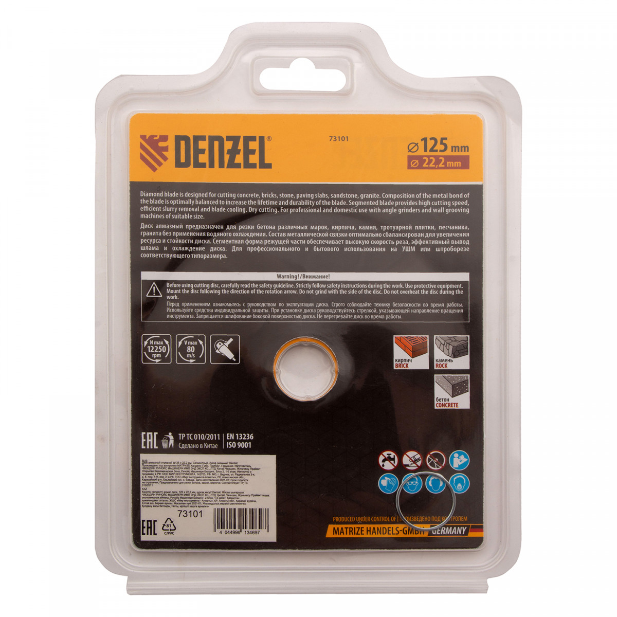 Отрезной сегментный алмазный диск Denzel 73101 диаметром 125 х 22,2 мм — оснастка для УШМ, использующаяся для сухой резки свежего и старого бетона, камня, кирпича, шлакоблока, мрамора, тротуарной плитки, гранита. Диск сегментного типа отличается высокой производительностью даже при интенсивных нагрузках. Подходит для бытового и профессионального использования.