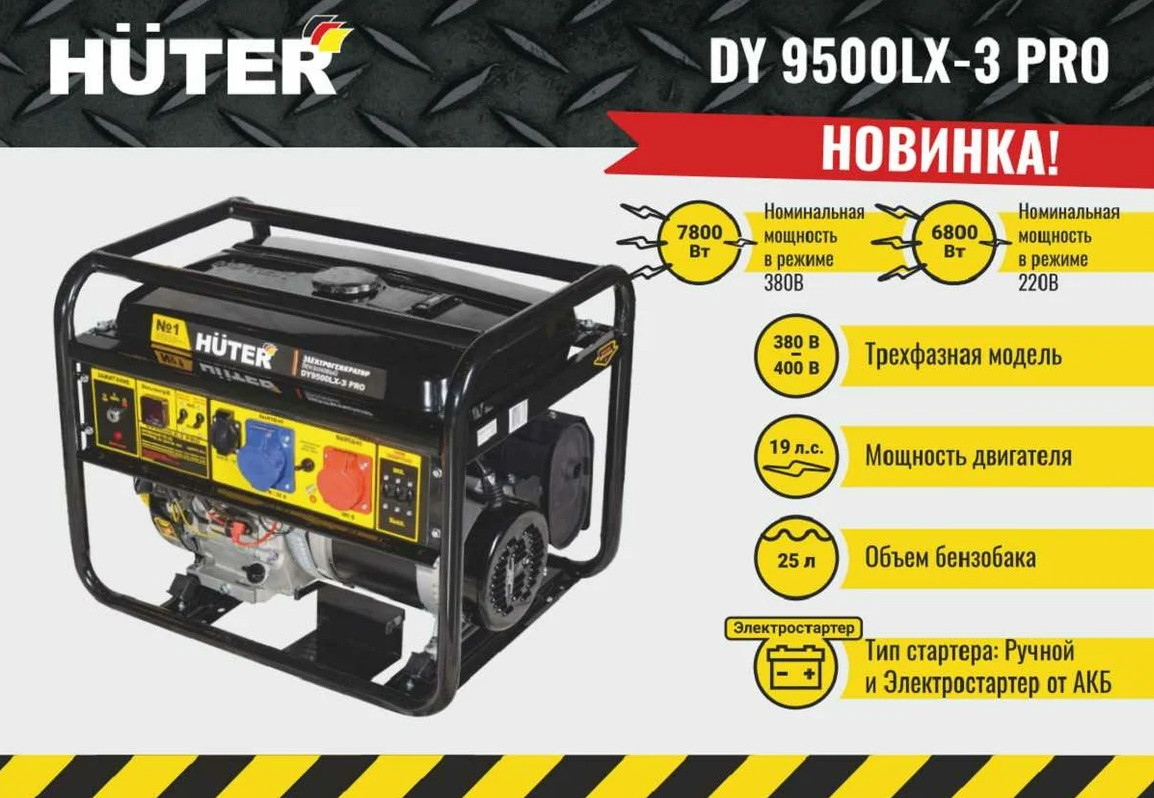 Электрогенератор Huter DY9500LX-3 PRO-электростартер 380В/220В 64/1/77 – портативная компактная электростанция, обеспечивающая электроснабжение бытовой техники и профессионального оборудования, питающегося от стандартной сети 220, а также 380 Вольт. Это самый выгодный бензиновый электрогенератор, с оптимальными техническими характеристиками и низким расходом топлива.