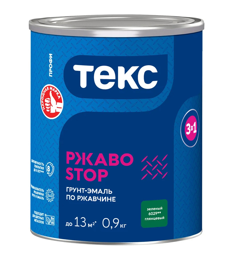 Грунт-эмаль 3в1 РЖАВОSTOP ПРОФИ зеленая глянцевая 0,9кг ТЕКС