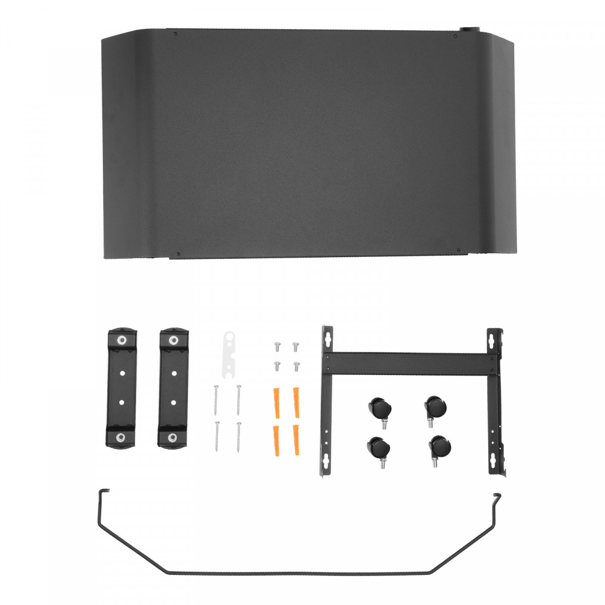 - Напольная или настенная установка — в комплект поставки включена цельнометаллическая крепежная рамка для стены, а также стальные ножки с колесами.