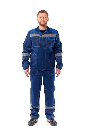 Костюм состоит из куртки и полукомбинезона. Куртка укороченная, на притачном поясе, с центральной потайной застежкой на петли и пуговицы. Рукава втачные, двух-шовные на манжетах с налокотниками, в нижней части настрочена светоотражающая полоса. Полочка и спинка с притачными кокетками контрастного цвета, на которые настрочена светоотражающая лента шириной 50 мм.
