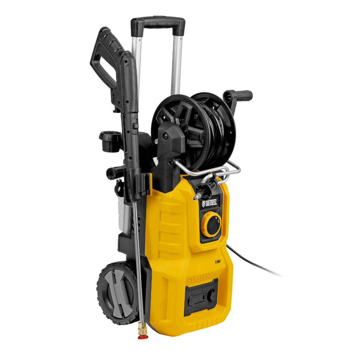 Мойка высокого давления, Барабан для шланга (установлен), Шланг высокого давления (установлен), Пистолет, Удлинитель пистолета, Сменные сопла 3 шт, Пеногенератор с бачком для моющего средства, Входной штуцер с фильтром, Быстросъемный коннектор шланга, кронштейн-держатель пистолета, Кронштей сетевого кабеля, Игла для прочистки сопла, Комплект крепежа, Инструкция с гарантийным талоном