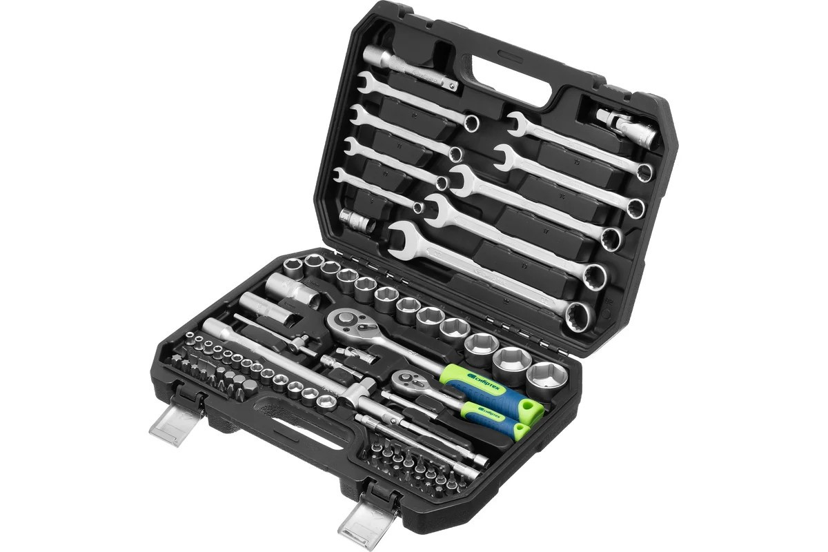 Набор инструментов упакован в пластиковый кейс и состоит из 82 предметов с присоединительным размером 1/2"" и 1/4"", предназначенных для слесарных работ, преимущественно монтажа и демонтажа резьбового крепежа с разными типами шлицев. В комплект поставки входят карданы, удлинители и переходники, облегчающие работу в труднодоступных местах. Набор используется для ремонта автомобилей, а также полезен в быту. ПреимуществаИзносостойкость — элементы набора изготовлены из высокопрочной сталиНадежная защита от коррозии — на инструменты нанесено матовое хромовое покрытиеКомфортная и эффективная работа — ключи-трещотки с 45 зубьями оснащены механизмом быстрого сброса, переключателем реверса с металлическим флажком и двухкомпонентной рукояткойПрочная фиксация — шариковый замок на трещотках, воротках, шарнирах и удлинителях надежно удерживает головкиУдобное хранение и транспортировка — инструменты и насадки упакованы в ударопрочный пластиковый кейс с металлическими замками
