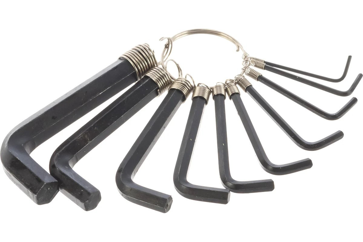 Набор имбусовых ключей на кольце 10шт.- это комплект шестигранных г-образных ключей, который предназначен для работы с крепежом, оснащенным внутренним шестигранным профилем. Данные ключи изготовлены из углеродистой стали, а твердость рабочей части 56-60 HRc.