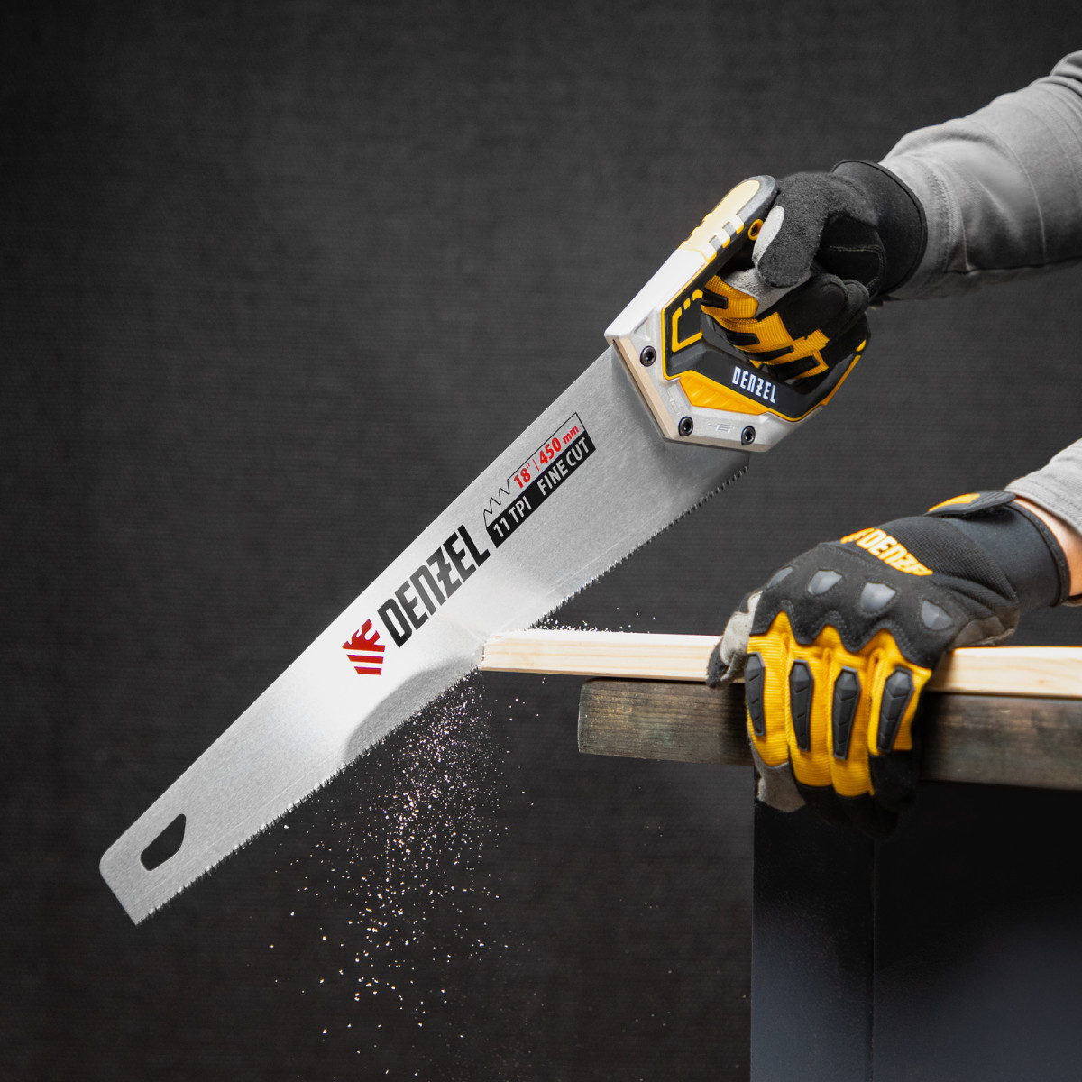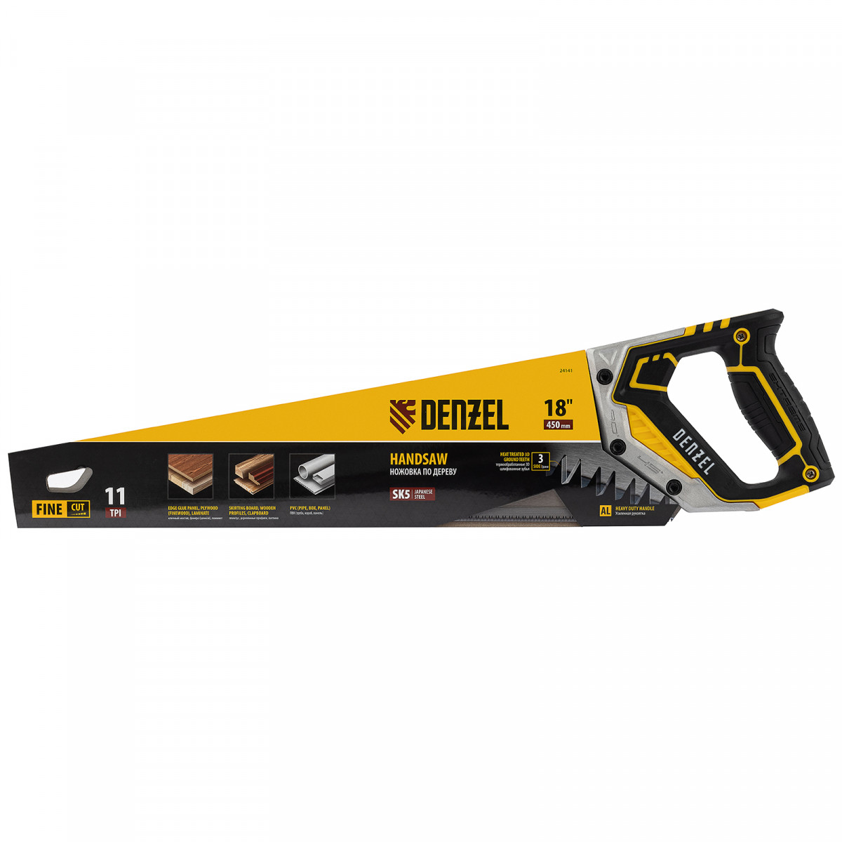 Ножовка по дереву Denzel 24141 длиной 450 мм, с зубьями с шагом 11 TPI и 3D-заточкой, с металлопластиковой рукояткой, предназначена для продольной и поперечной распиловки заготовок из древесины, ДСП, ДВП, МДФ, ламината, а также из ПВХ (труб, панелей, коробов). Подходит для распиливания плинтусов, вагонки, деревянных профиле й. Мелкие зубья с шагом 11 TPI позволяют выполнять точный и чистый рез. Ножовка используется для проведения столярных работ в мастерской и на дачном участке.
