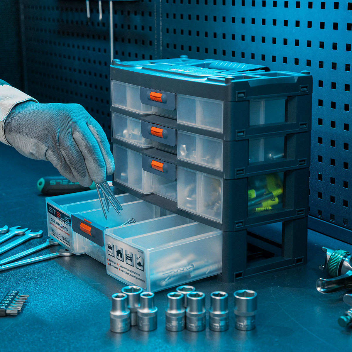 Органайзер Stels 90728 размером 310 х 150 х 260 мм, из пластика, имеет 4 секции с выдвижными лотками и используется для хранения крепежных элементов, принадлежностей для рукоделия, снастей и т.д. Обеспечивает быстрый доступ к предметам, позволяет избежать их перемешивания и утери. Пригодится в гараже, мастерской, будет полезен в домашнем хозяйстве.