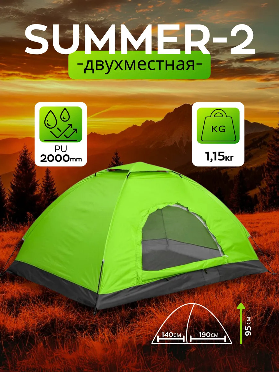 Палатка SUMMER-2 (ZH-A034-2) - это двухместная легкая и компактная палатка, которая идеально подойдет для отдыха на природе. Особенности: - Купол палатки изготовлен из однослойного материала и имеет 1 широкий вход - Тент изготовлен из полиэстера (polyester 190T) и имеет специальную пропитку, которая придает ему прочность и долговечность, а также защищает от выгорания и преждевременного износа - Антимоскитная сетка - Вентиляционные клапаны (с защитой от влаги и дождя) в верхней части палатки обеспечат комфортный микроклимат Характеристики: * Назначение: Треккинговая * Сезон: Лето * Форма палатки: Полусфера * Габариты палатки в рабочем состоянии: 190*140*95 см. * Вход: 100*55 см * Внешний тент: Polyester 190T PU 2000 мм * Материал дна: Polyester 210D PU 2500 мм * Вес палатки: 1,15 кг * Каркас: Fiberglass 7,5 мм * В комплект входят 4 ввертыша * Размер в упакованном виде: 60х12х8 см. * Цвет: зеленый