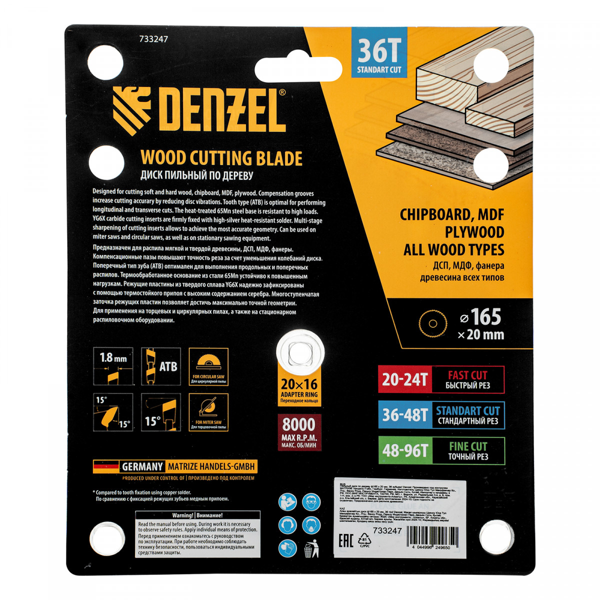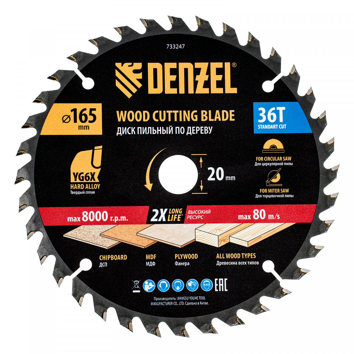 Пильный диск Denzel 733247 диаметром 165 x 20 мм, с 36 зубьями, предназначен для продольного и поперечного распила твердой и мягкой древесины, фанеры, МДФ, ДСП. 36 зубьев типа ATB с режущими пластинами оптимальной геометрии обеспечивают качественный рез. Тип реза — стандартный. Режущие пластины из твердого сплава YG6X сохраняют рабочие свойства при интенсивном использовании. Диск устанавливается на циркулярную, торцовочную пилу или на распиловочный станок. В комплект поставки входит переходное кольцо с 20 на 16 мм, что позволяет изменить посадочный размер и расширяет возможности использования диска.
