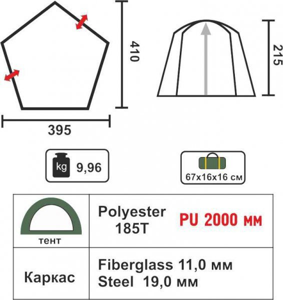 Большой шатер с противомоскитной сеткой и пологами защитит от ветра, дождя, яркого солнца и насекомых. Пологи пристегиваются к шатру молниями. Помимо оснащен полочко-сеткой под куполом шатра. Водонепроницаемость: 2000 мм. водяного столба. Каркас: fiberglass 11,0 мм, сталь 19 мм. Материал: Polyester 185Т. Геометизация швов: проклеены. Размеры шатра: 410х395х215 см. Размер в упакованном виде: 67х16х16см. Вес: 10 кг.