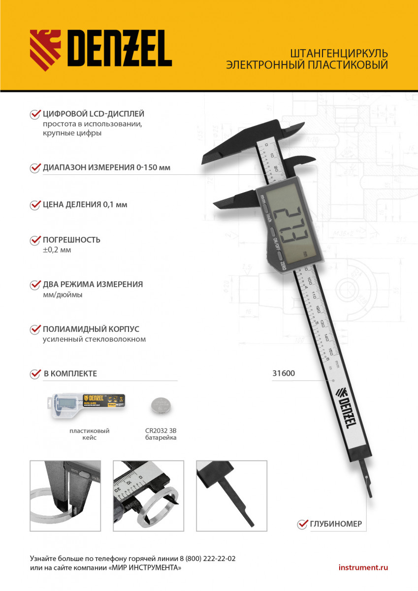 Штангенциркуль пластиковый, 150 мм, электронный, большой дисплей, с глубиномером Denzel